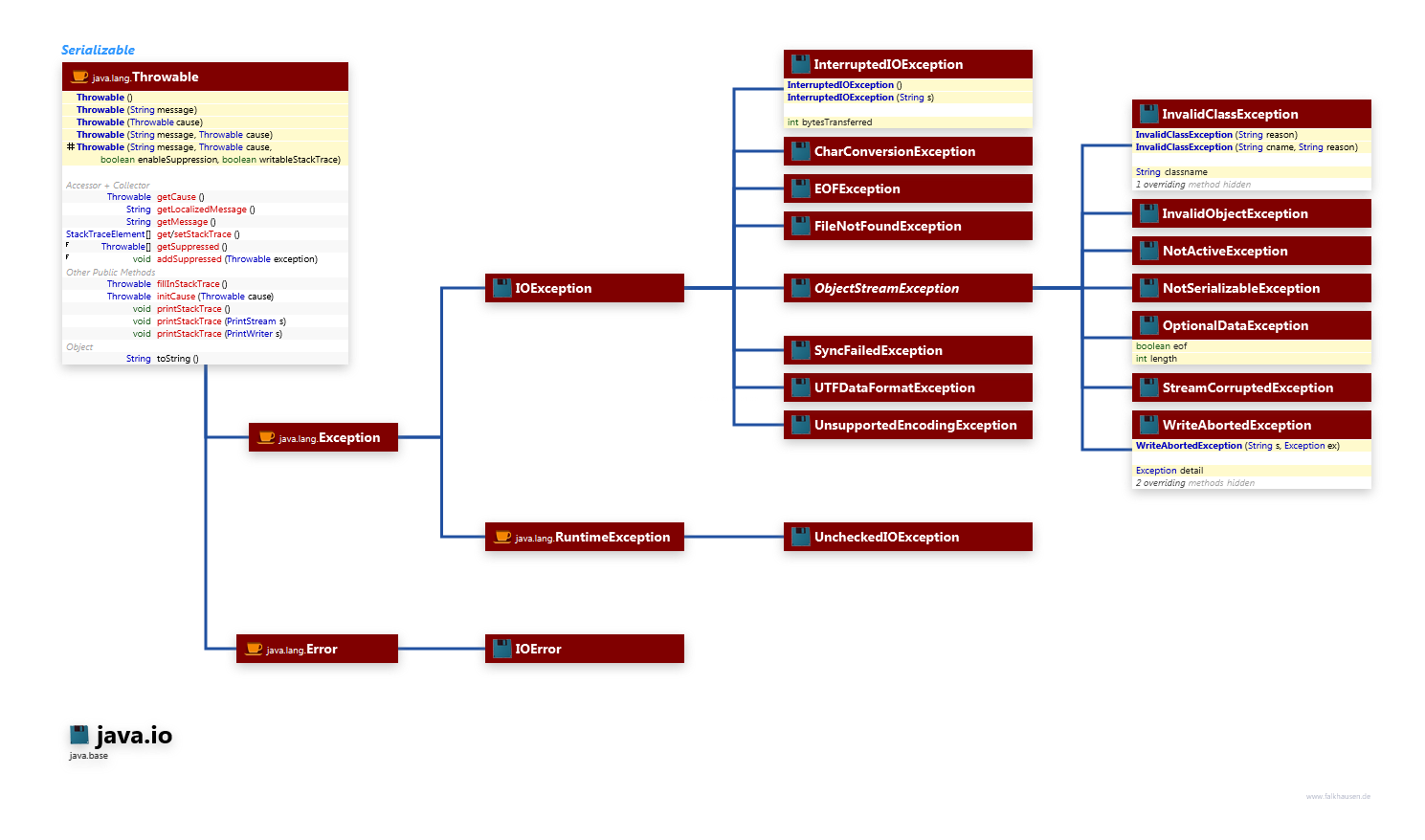 CharConversionException, EOFException, FileNotFoundException, IOError, IOException, InterruptedIOException, InvalidClassException, InvalidObjectException, NotActiveException, NotSerializableException, ObjectStreamException, OptionalDataException, StreamCorruptedException, SyncFailedException, UTFDataFormatException, UncheckedIOException, UnsupportedEncodingException, WriteAbortedException